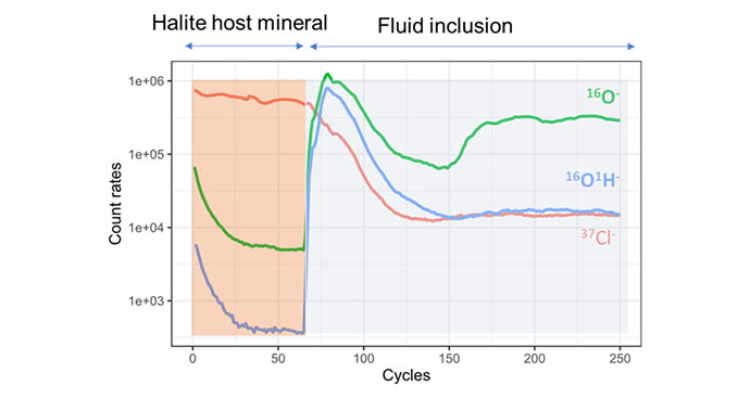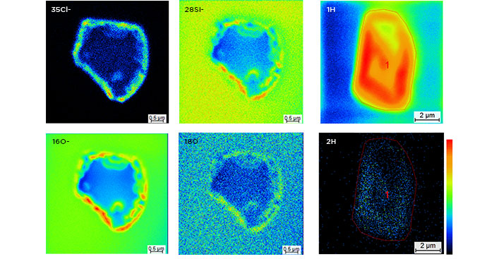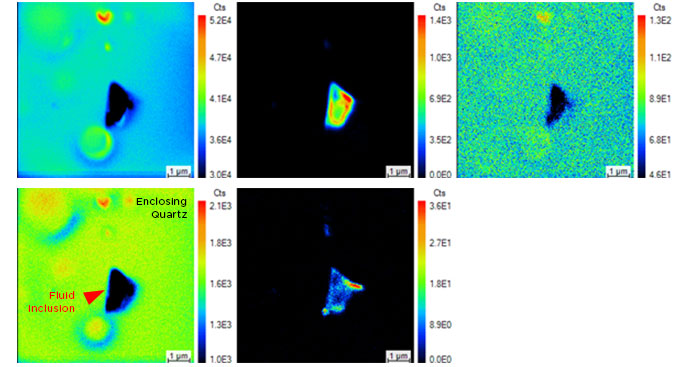 NanoSIMS-HR readily imaged fluid inclusions highlighted in red within the halite sample mounted on a cold stage. Micrometric heterogeneities were revealed with a lateral resolution of <200 nm, including: